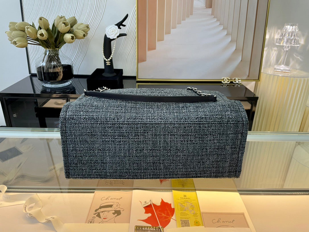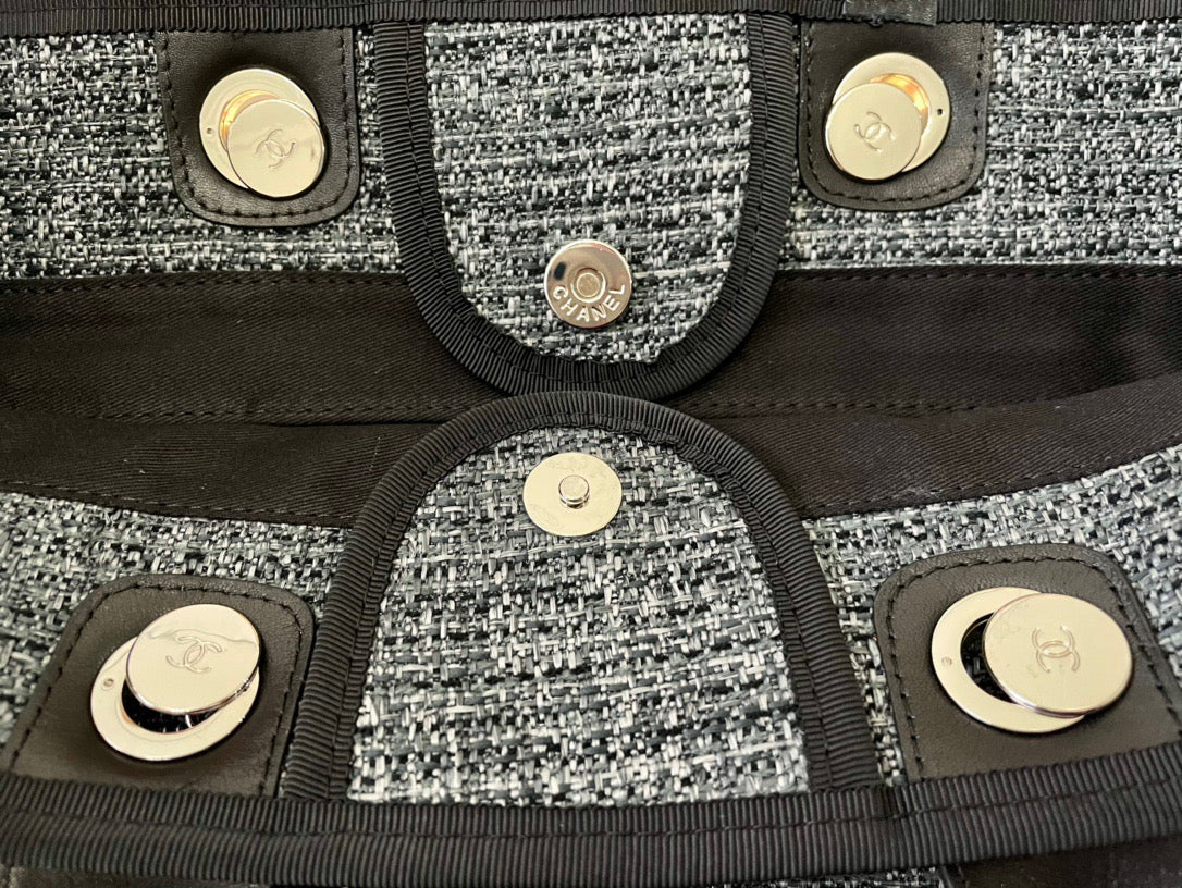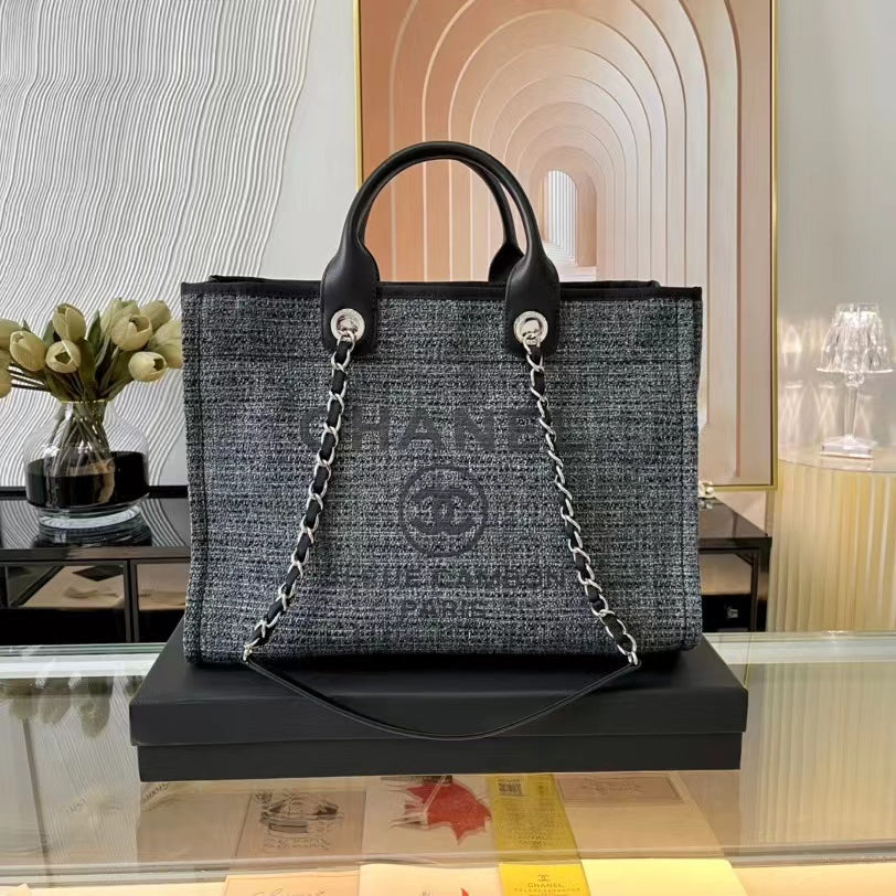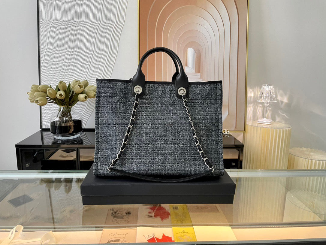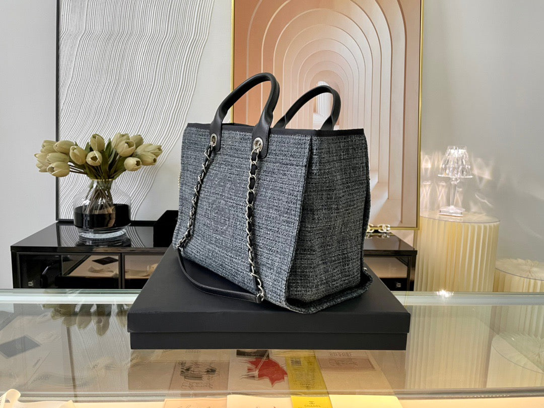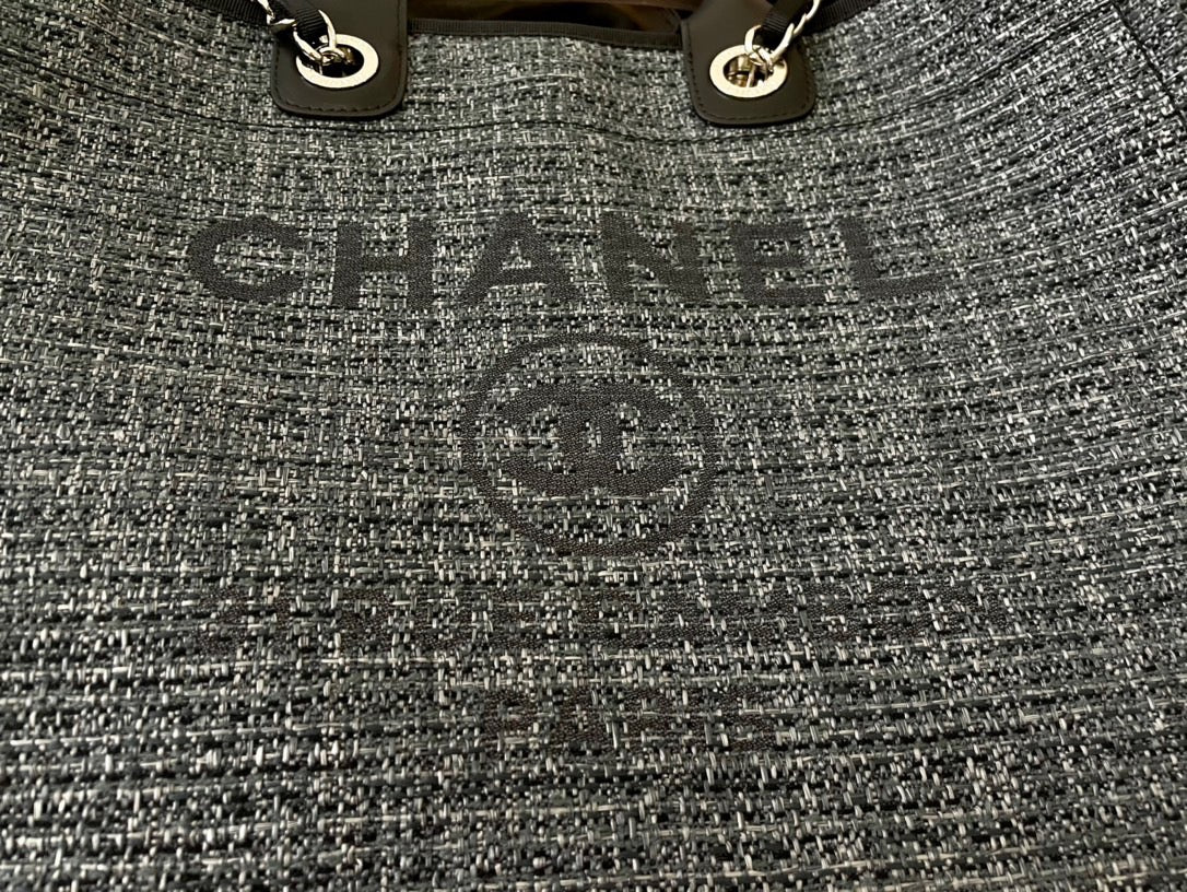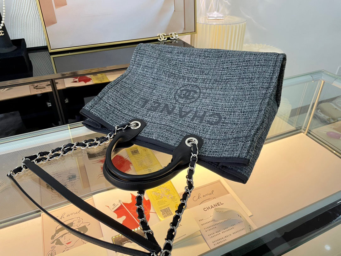 CHANEL Beach Canvas Tote Bag In Gray With Black Leather Strap