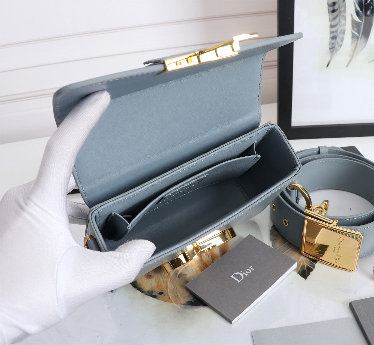 - Large, removable and adjustable leather shoulder strap with 'Christian Dior' military-inspired buckle
